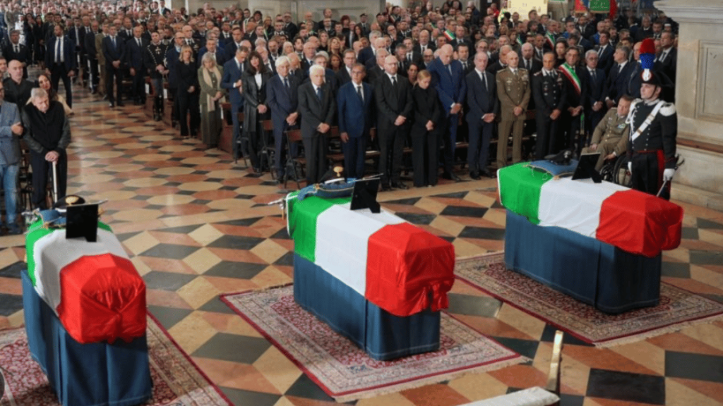 Ai funerali di Stato per il sottotenente Marco Piffari, il maresciallo Valerio Daprà e l’appuntato scelto Davide Bernardello, il ministro della Difesa Guido Crosetto pronuncia un discorso destinato a restare: «L’Italia è qua e si raccoglie in un profondo dolore», promettendo che la memoria dei caduti resterà incisa «nella roccia della Repubblica».