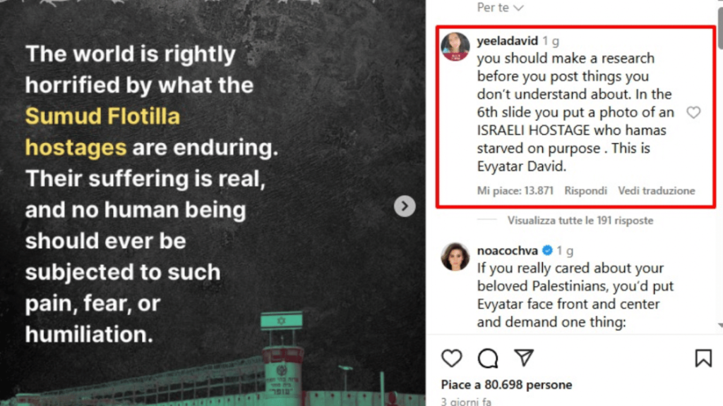L’immagine, segnalata da numerosi utenti, è stata rimossa poche ore dopo, ma lo scivolone ha scatenato un’ondata di indignazione. A denunciarlo pubblicamente è stata Yeela David, sorella dell’ostaggio: “Dovresti informarti prima di pubblicare cose che non capisci. Nella sesta slide hai messo la foto di un OSTAGGIO ISRAELIANO che Hamas ha fatto morire di fame di proposito”, ha scritto nei commenti sotto il post.