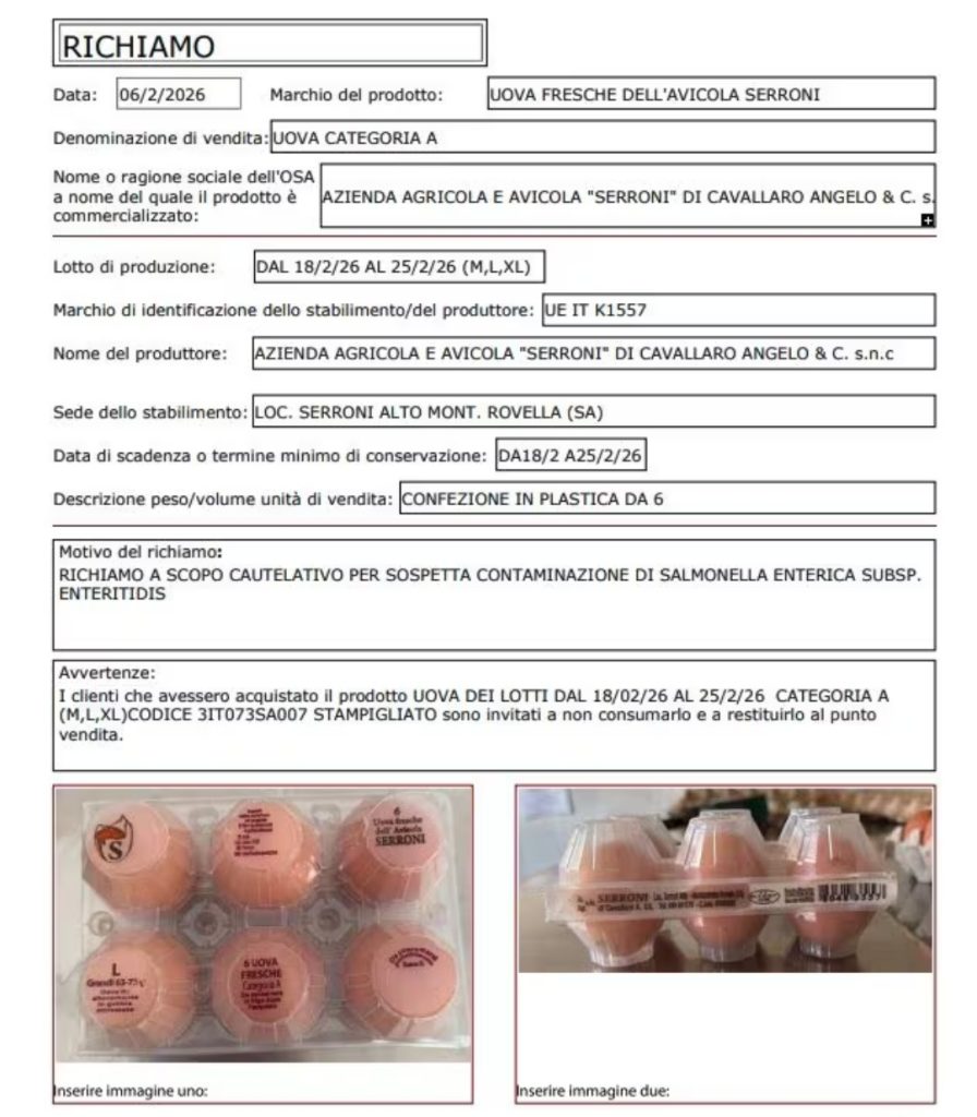 Il richiamo riguarda specificamente i lotti di uova fresche con data di scadenza compresa tra il 18 e il 25 febbraio 2026, appartenenti alle categorie M, L e XL. Queste uova sono state prodotte dall’Azienda agricola e avicola Serroni di Cavallaro Angelo & C. s.n.c., situata a Montecorvino Rovella, in provincia di Salerno. L’azienda ha già avviato il ritiro dei lotti ancora invenduti, invitando i consumatori a non consumare le uova interessate e a restituirle al punto vendita.